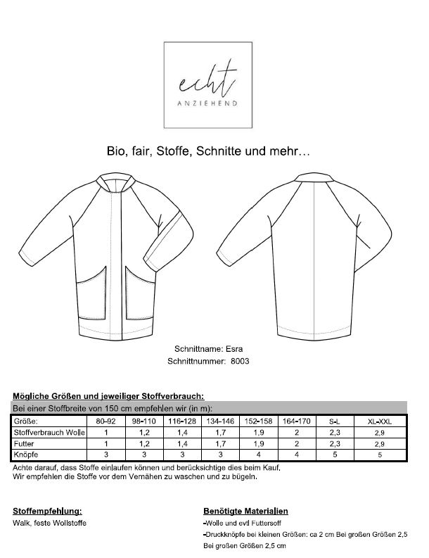 Unser Esra Mantel ist der perfekte Begleiter für den Winter. Kennt ihr das Problem, dass eure Oversize und Strickpullover nicht unter die Winterjacke passen? Tja, nicht mit dem Esra. Wir haben uns Gedanken gemacht und extra viel Platz unter den Armen gelassen. Auch die Ärmel haben genug Platz für dicke Pullover darunter. Ob du den Mantel füttern möchtest oder nicht, bleibt dir überlassen. Du bekommst 2 Anleitungen mit, einmal gefüttert und einmal ungefüttert.