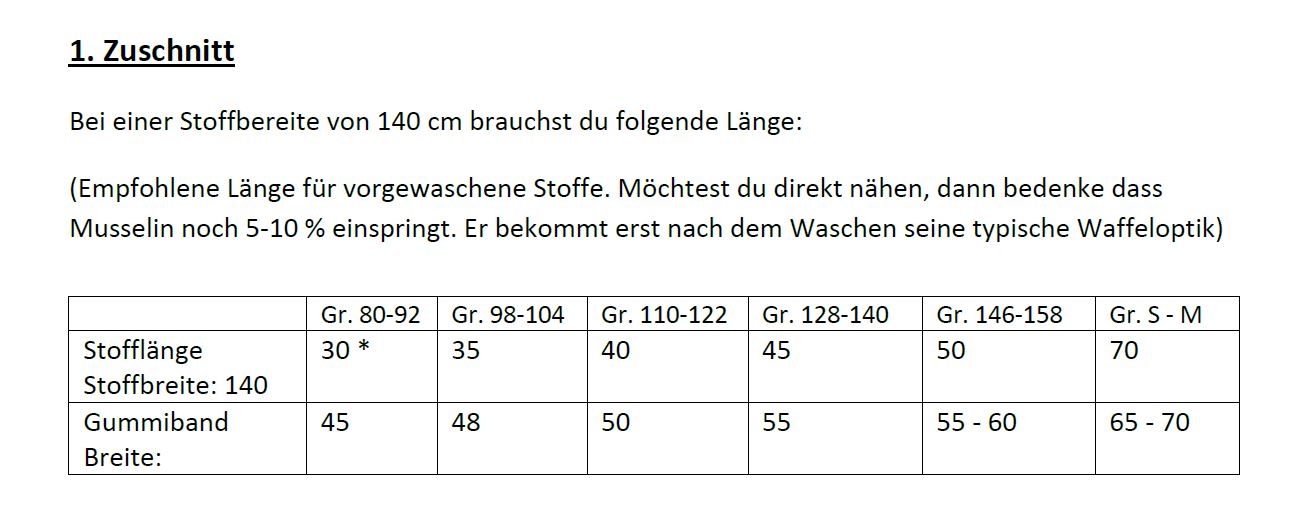 In dieser Schnittanleitung sind alle Größen von Kinder Größe 80 bis Erwachsen Größe M enthalten.