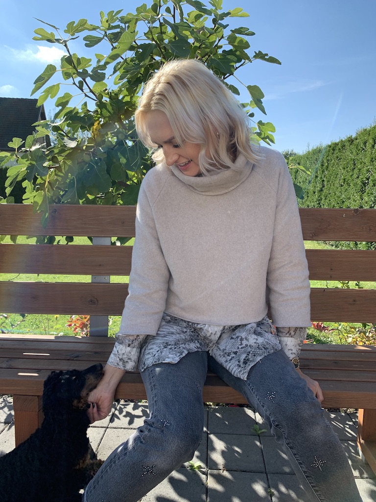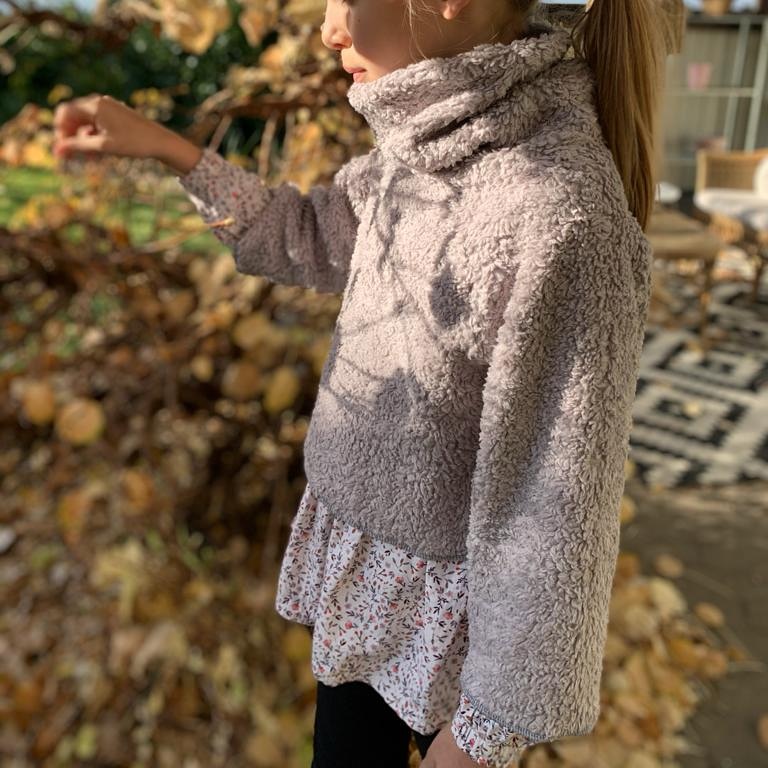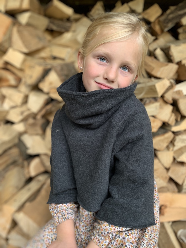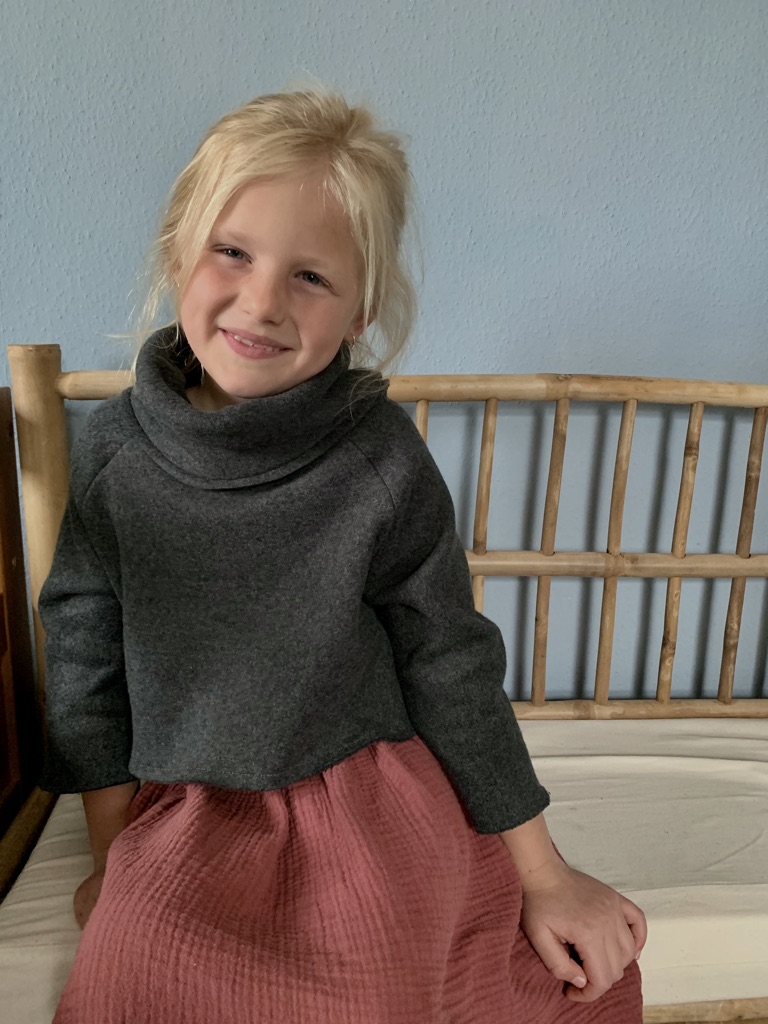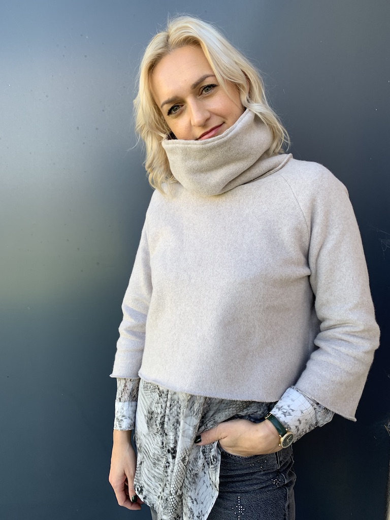 Ein Pullover mit offenen Kanten, doppelten Kragen und ein wenig kürzer geschnitten. Einfach wunderbar über Kleider, Blusen und perfekt für High Waist Hosen.