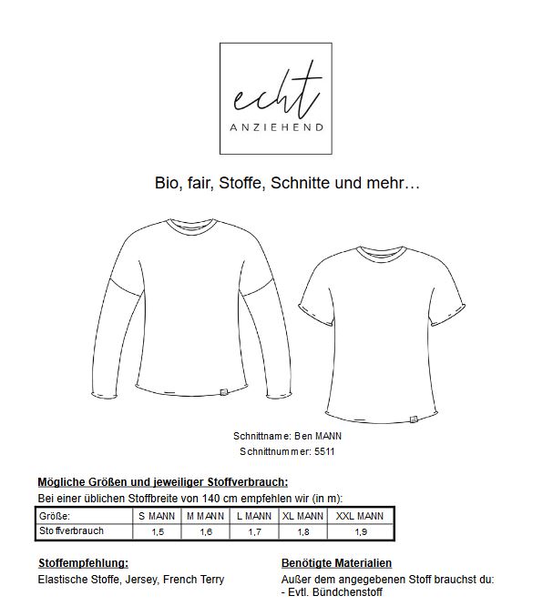 Der Ben ist ein tolles Basic Langarmshirt, welches absolut unisex ist. Den Schnitt erhälst du zurzeit für Kinder und für Frauen. Folge uns auf Instagram, denn dort findest du nicht nur viel mehr Inspiration rund um den Schnitt Ben (#benechtanziehend), sondern auch eine Anleitung unter den Highlights, wie du ganz fix ein T-Shirt aus dem Ben nähen kannst.