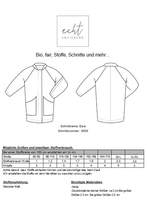 Unser Esra Mantel ist der perfekte Begleiter für den Winter. Kennt ihr das Problem, dass eure Oversize und Strickpullover nicht unter die Winterjacke passen? Tja, nicht mit dem Esra. Wir haben uns Gedanken gemacht und extra viel Platz unter den Armen gelassen. Auch die Ärmel haben genug Platz für dicke Pullover darunter. Ob du den Mantel füttern möchtest oder nicht, bleibt dir überlassen. Du bekommst 2 Anleitungen mit, einmal gefüttert und einmal ungefüttert.