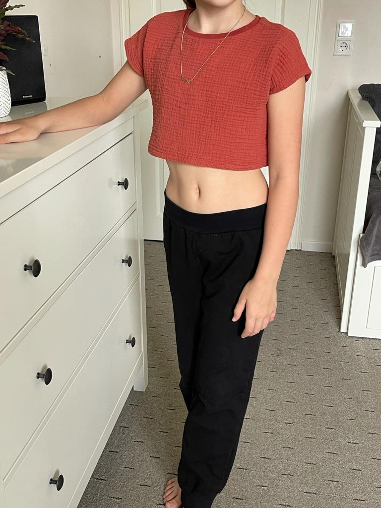 Du kannst die Bündchen (Bauch und Beine) aus dem selben Stoff machen, welcher natürlich nicht so dehnbar ist wie Bündchenware, oder aus super elastischer Bündchenware.
