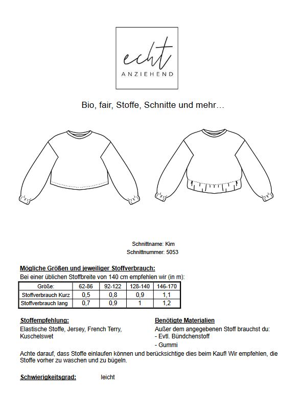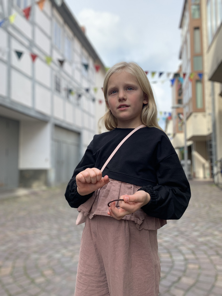 Den Kim Pullover kannst du in kurz ohne Gummi nähen oder in ein wenig länger (trotzdem verhältnismäßig ehr kurz) mit Gummi. Ein Pullover für den Zwiebellook konzipiert. Und auch als Sportpulli eignet er sich hervorragend.