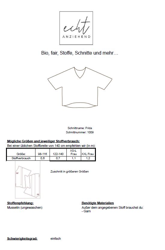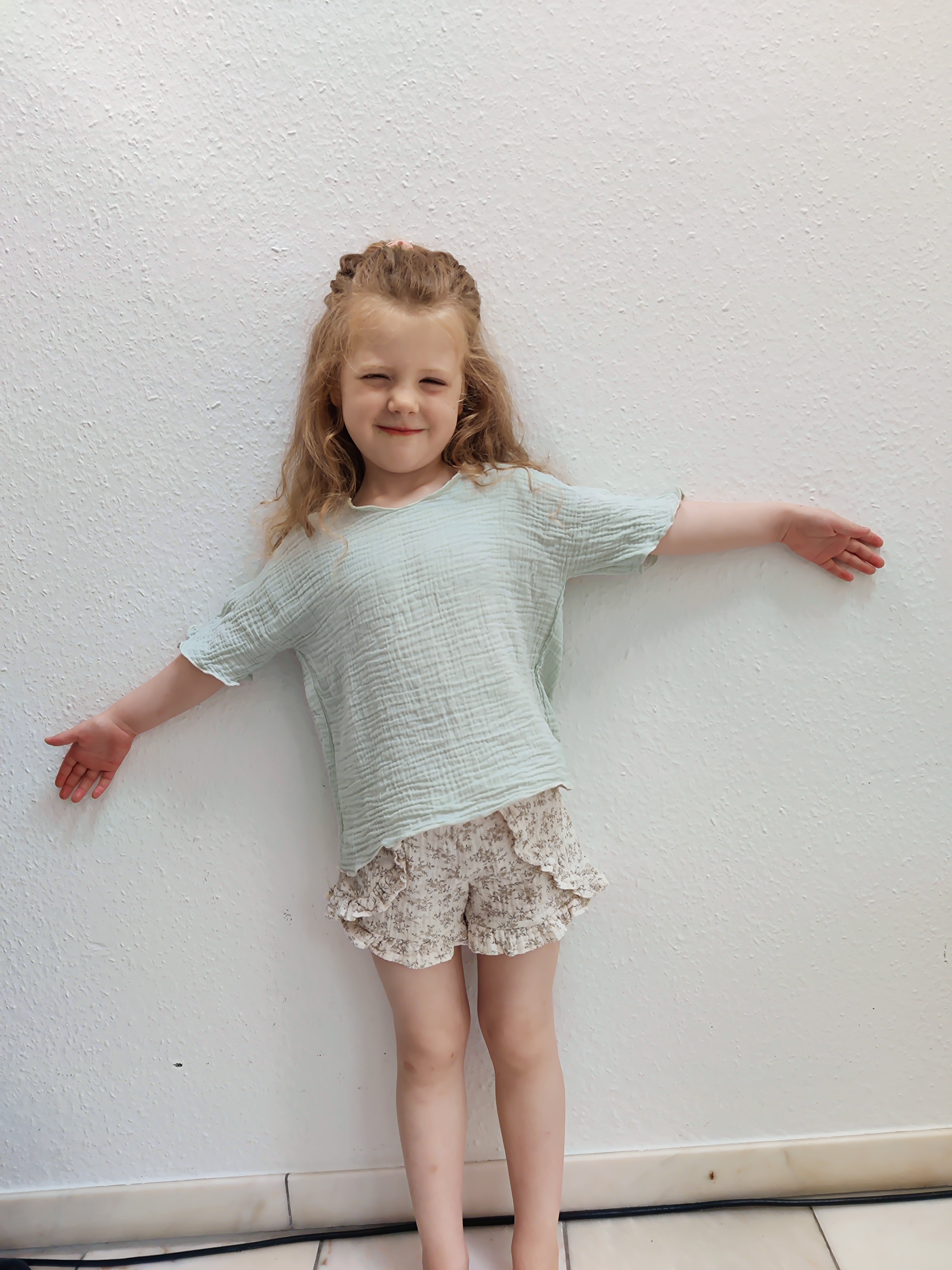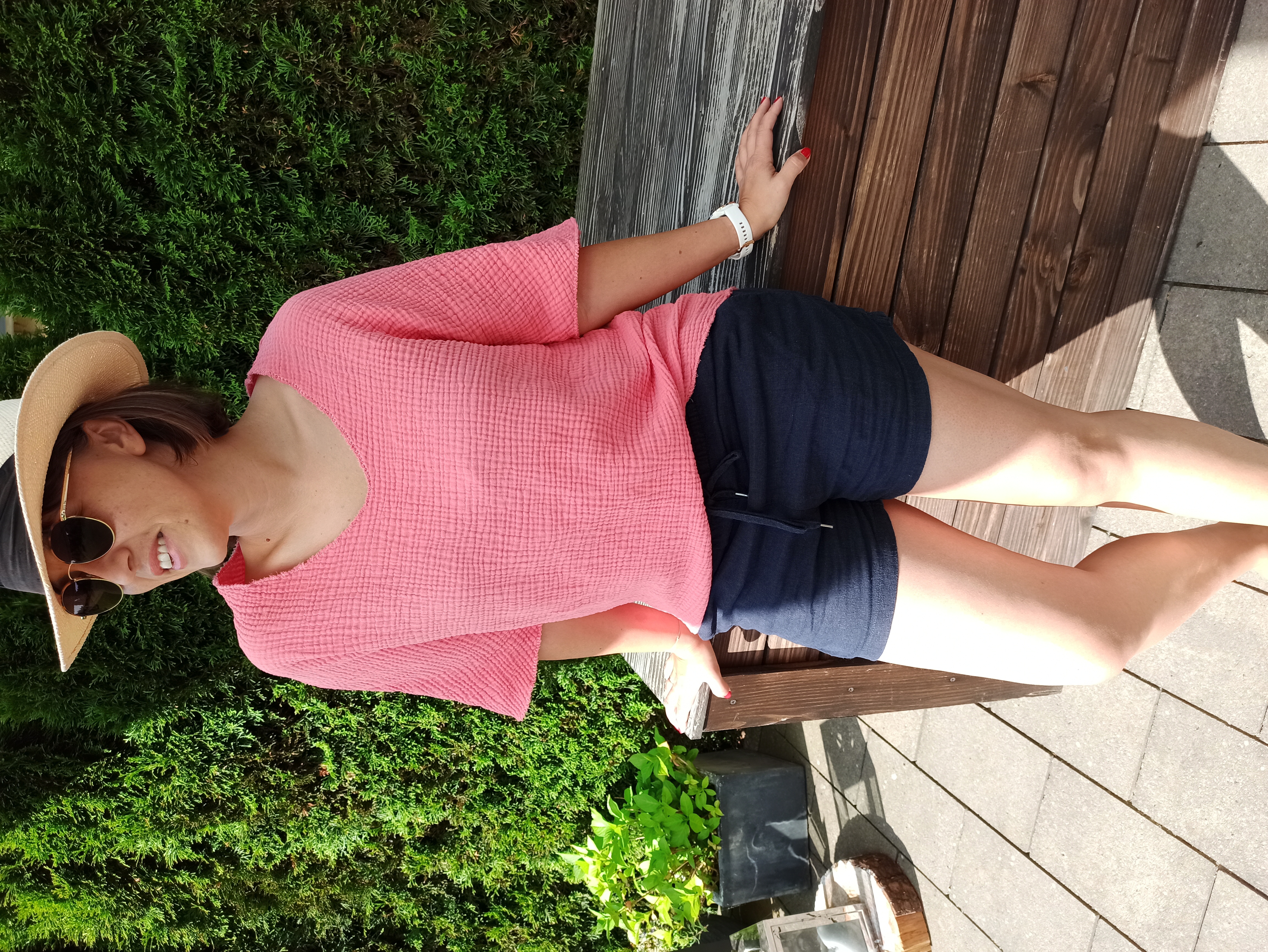 Frida ist ein toller und einfacher Schnitt, der für den Sommer perfekt ist. An heißen Tagen trägt sich das T-Shirt aus Musselin sehr angnehm auf der Haut. Man möchte es gar nicht mehr ausziehen.