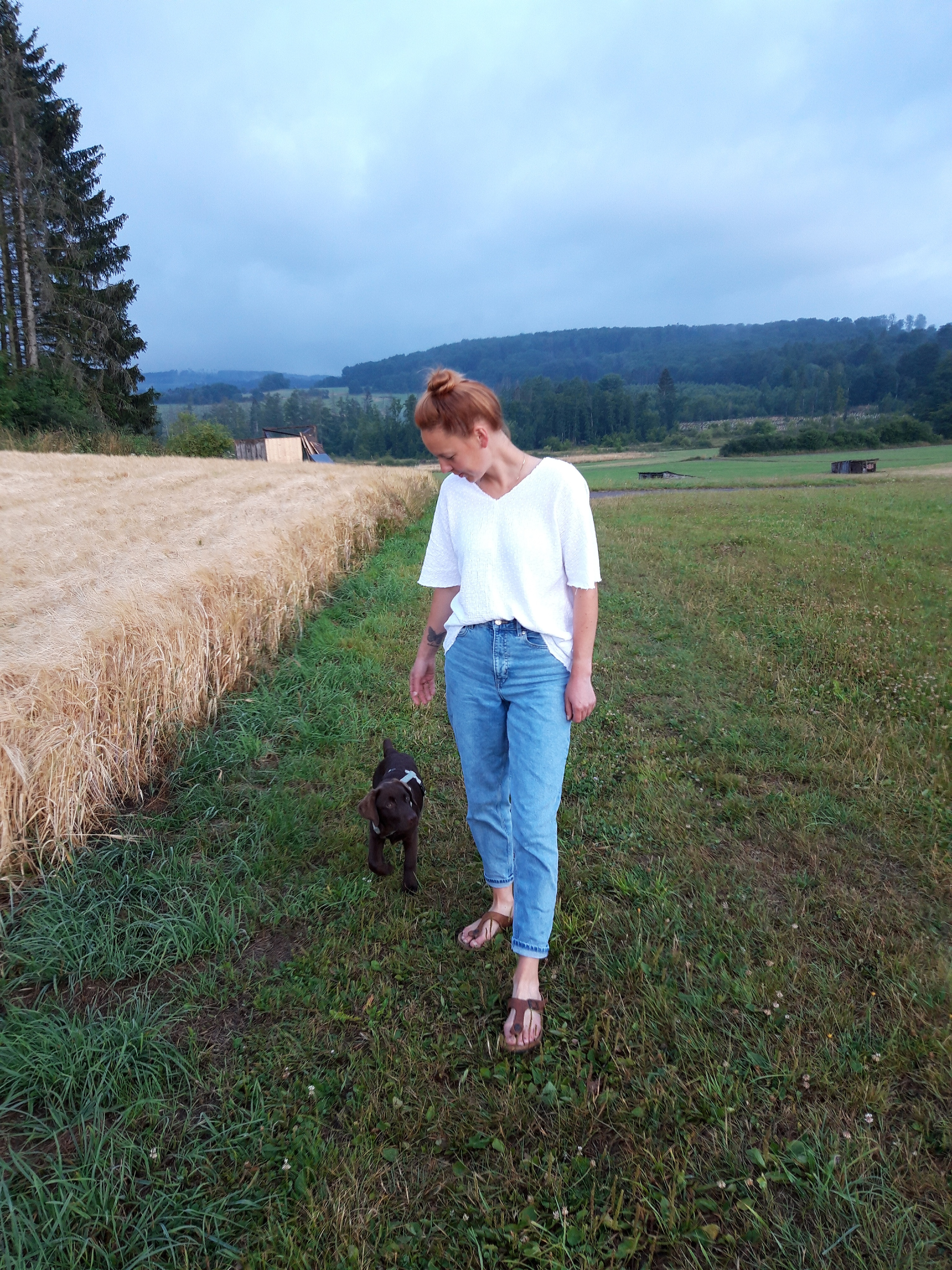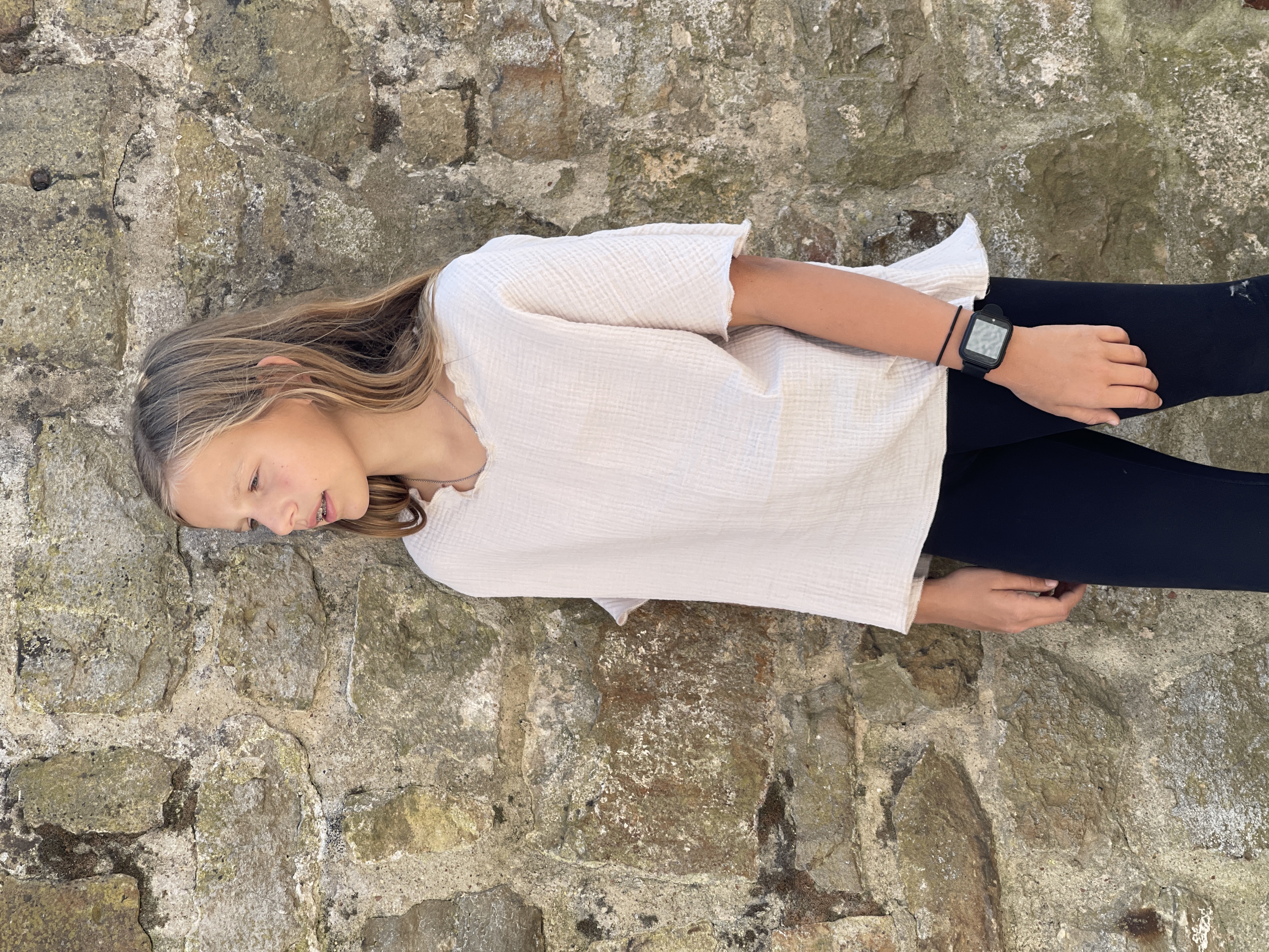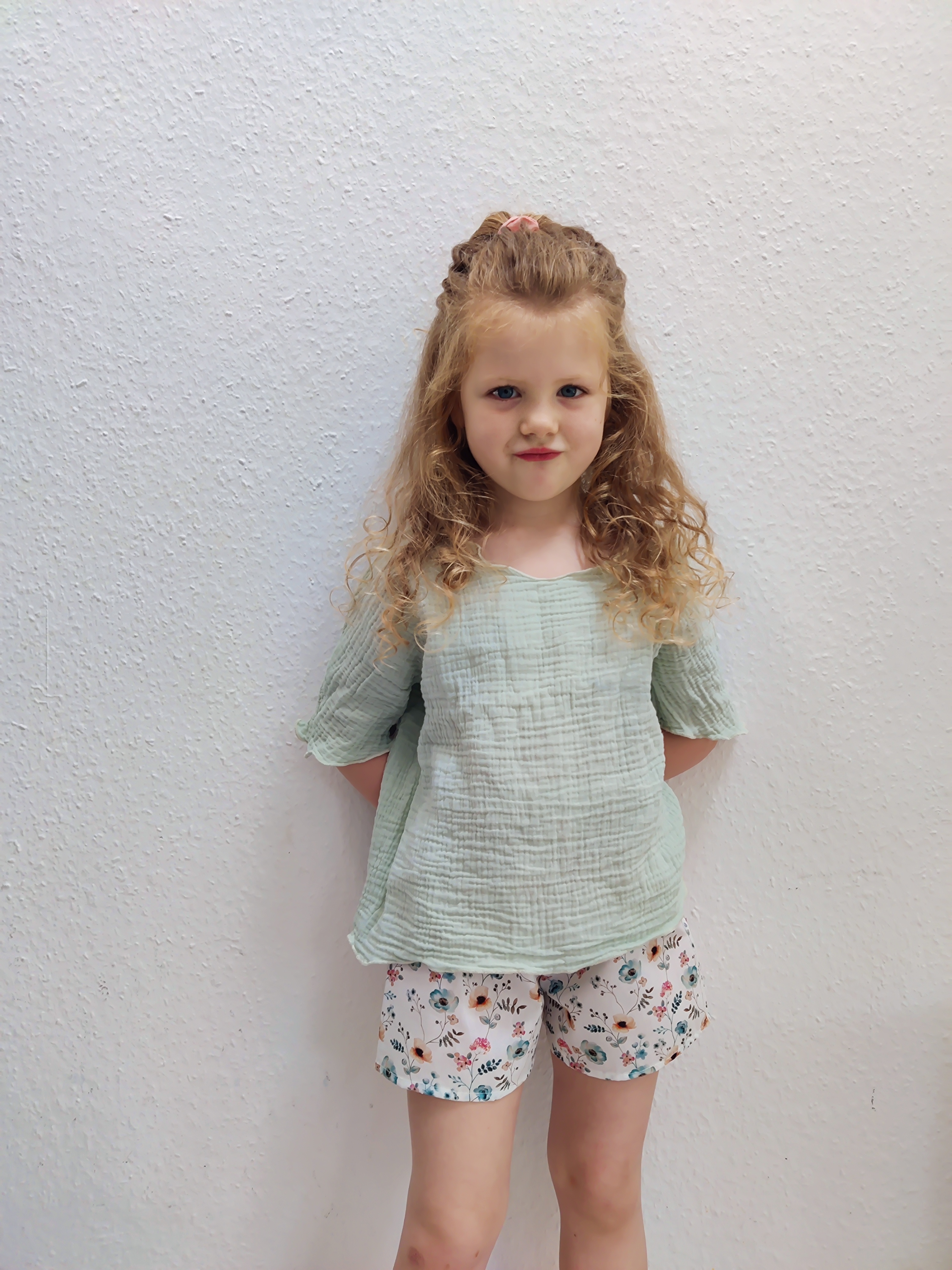 Frida ist ein toller und einfacher Schnitt, der für den Sommer perfekt ist. An heißen Tagen trägt sich das T-Shirt aus Musselin sehr angnehm auf der Haut. Man möchte es gar nicht mehr ausziehen.